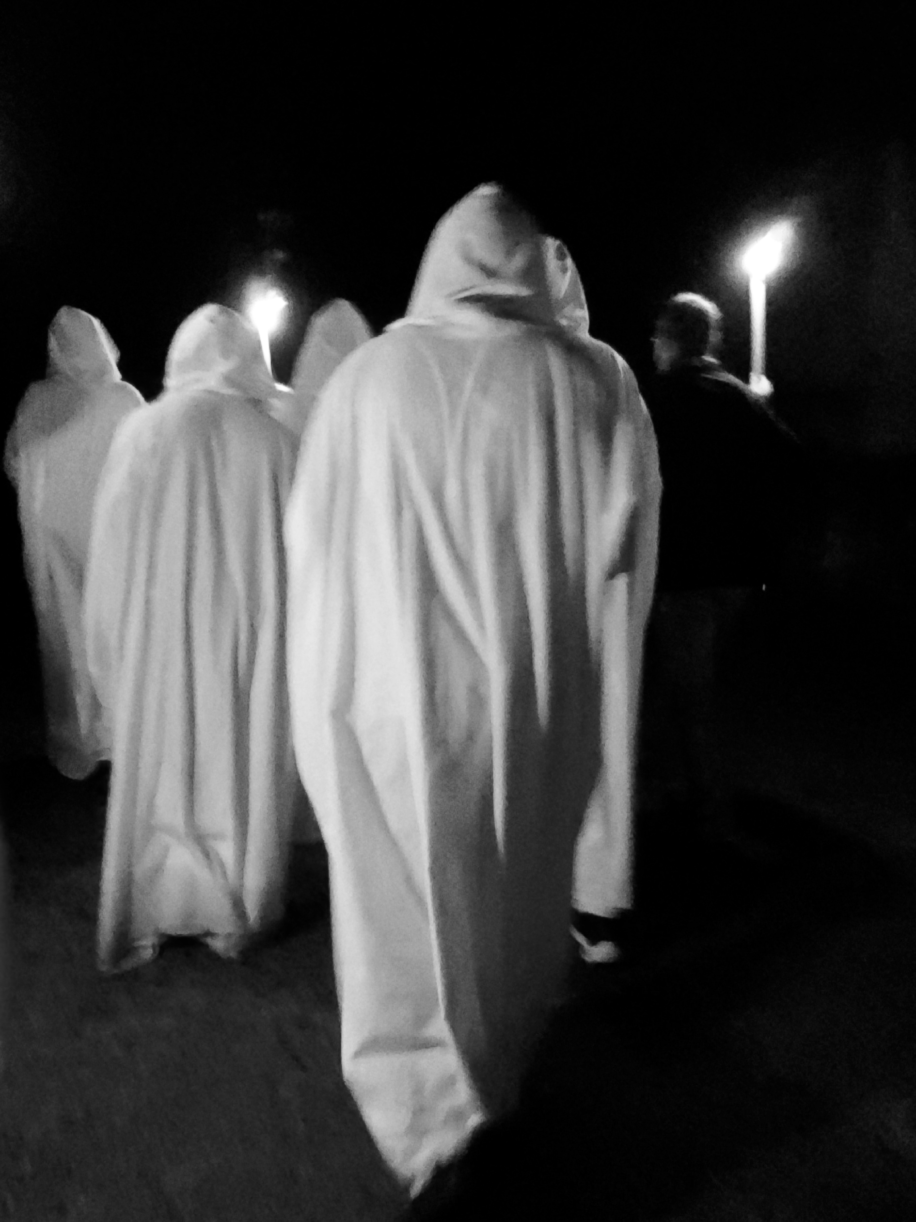 3. Con nuestras calabazas talladas y con una vela en su interior, las colocamos por las ventanas y puertas de las casas de Radiquero, para que las ánimas no ‘dominen’ esa casa. Y después guían a la ‘Triste comitiva’ de ‘almetas’ y ‘totones’ a su morada natural, el cementerio de Radiquero. Allí las despiden con una proyección de un vídeo-resumen sobre la pared del cementerio.