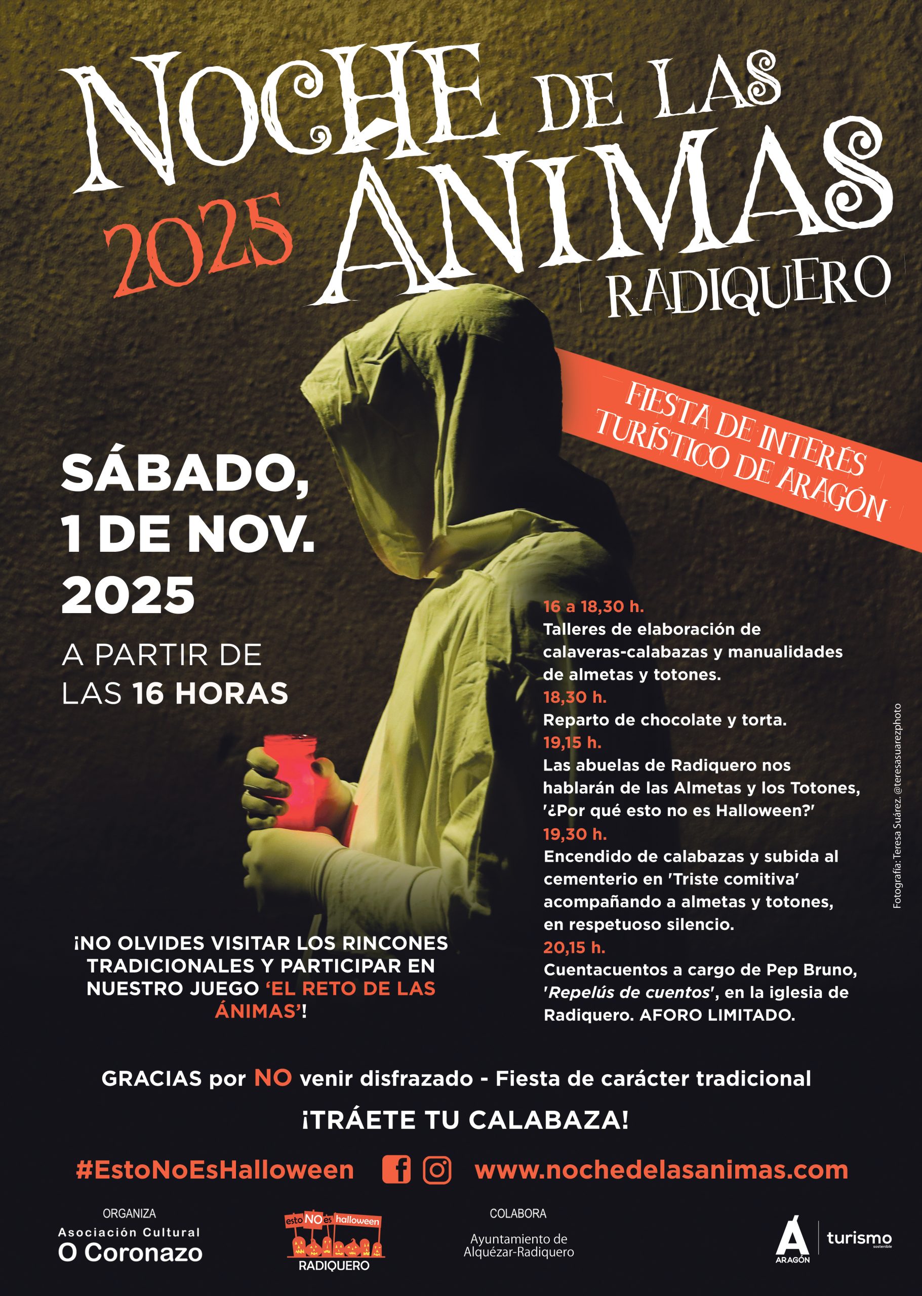Además, a media tarde se reparte chocolate con torta y se llena el pueblo de ‘rincones misteriosos’, con mobiliario y escenografía tradicional, para hacer llegar a los visitantes las tradiciones y costumbres en torno a la muerte en el alto Aragón, y que esta festividad se viene celebrando mucho antes que el famoso ‘Halloween’. Todo ello es posible gracias a los personajes que pueblan las calles: el ‘fosaire’ (enterrador), nuestras abuelas, las ánimas y el ‘totón’ de Radiquero.